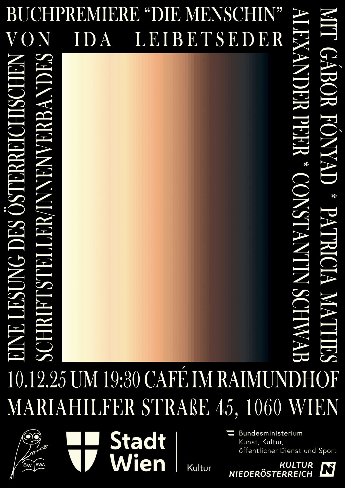 Am Mittwoch, dem 10. Dezember um 29 Uhr 30 findet die Buchpremiere von Ida Leibetseders „Die Menschin“ im Raimundhof statt. Außerdem Lesen Gábor Fónyad, Patricia Mathes, Alexander Peer und Constantin Schwab aus ihren Werken.