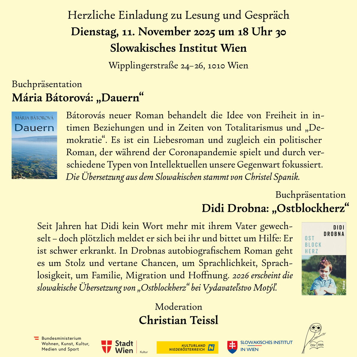 Am Dienstag, dem 11. November um 18 Uhr 30 findet eine Lesung von Maria Bátorová („Dauern“) und Didi Drobna („Ostblockherz“) im Slowakischen Institut Wien statt.
