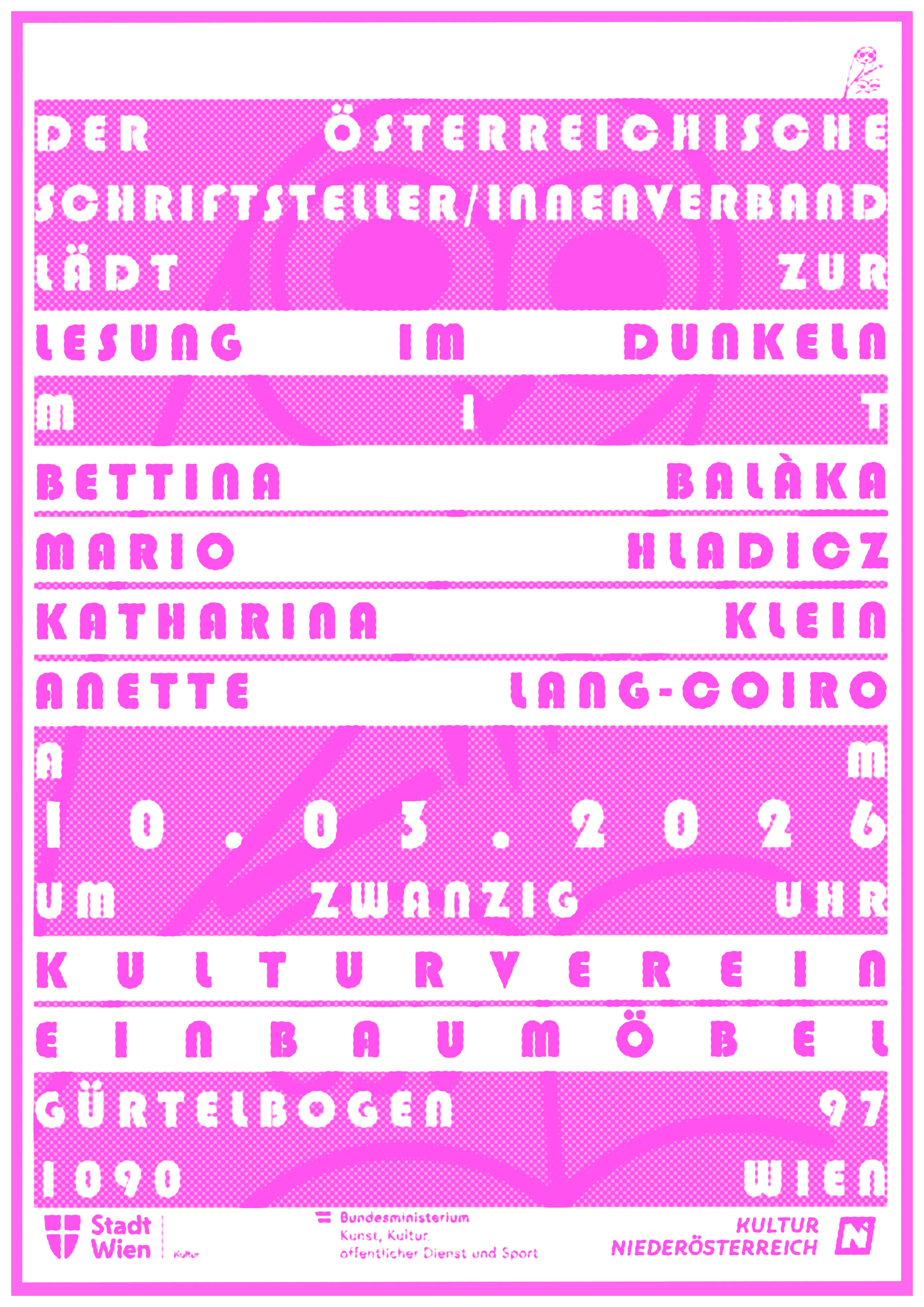 Am Dienstag, dem 20. März um 20 Uhr findet im Kulturverein Einbaumöbel wieder eine „Lesung im Dunkeln“ statt. Bettina Balàka, Mario Hladicz, Katharina Klein und Anette Lang-Coiro lesen – in völliger Dunkelheit.