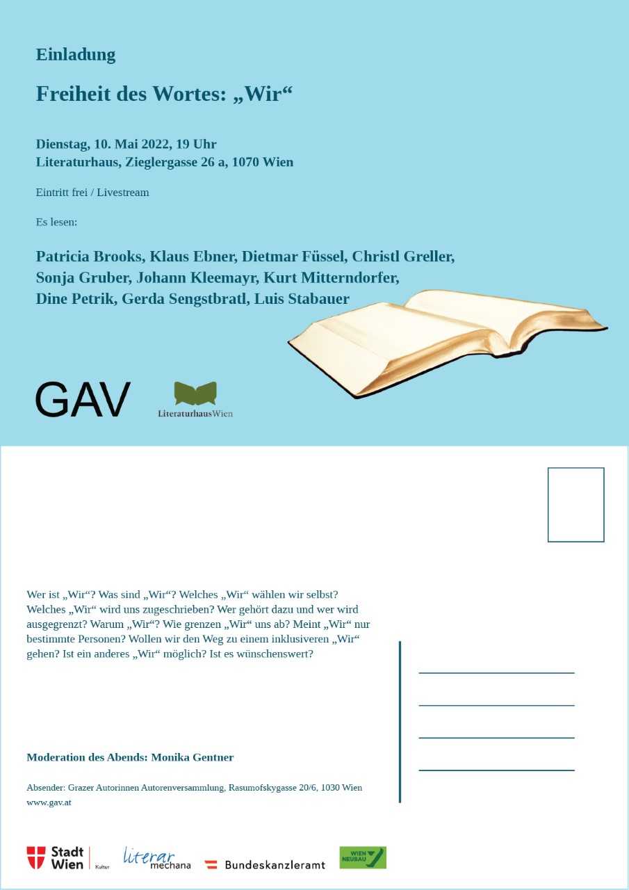 Am Dienstag, dem 10. Mai 2022 findet im Wiener Literaturhaus ab 19:00 Uhr eine Lesung zum Thema Freiheit des Wortes "Wir" statt. Unter den Lesenden befinden sich unter anderem die ÖSV-Mitglieder Klaus Ebner, Christl Greller und Gerda Sengstbratl; es moderiert Monika Gentner. Ein Livestream der Lesung ist verfügbar.