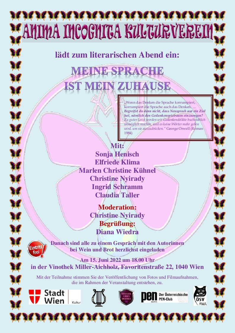 Am Mittwoch, dem 15. Juni 2022 findet in der Vinothek Miller-Aichholz in der Favoritenstraße 22 ein vom Animal Incognita Kulturverein veranstalteter literarischer Abend statt. Es lesen Sonja Henisch, Elfriede Klima, Marlen Christine Kühnel, Christine Nyirady, Ingrid Schramm und Claudia Taller. Die Moderation übernimmt Christine Nyirady, Diana Wiedra die Begrüßung. Danach sind alle zu einem Gespräch mit den Autorinnen bei Wein und Brot herzlich eingeladen.