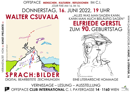 Am Donnerstag, dem 16. Juni 2022 um 19:00 Uhr findet im 16. Wiener Gemeindebezirk in der Payergasse 14 im OFFSPACE Club ein Jour fixe statt. Zu sehen ist eine Vernissage, Lesung und Ausstellung. Eine literarische Hommage an Elfriede Gerstl zum 90. Geburtstag wird veranstaltet mit Walter Csuvala, Karin Gayer, Doris Kloimstein und grauenfruppe.